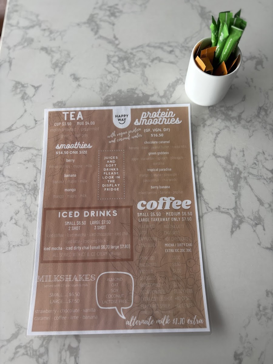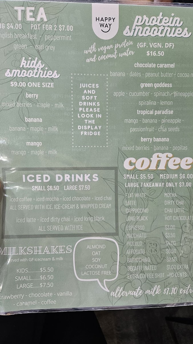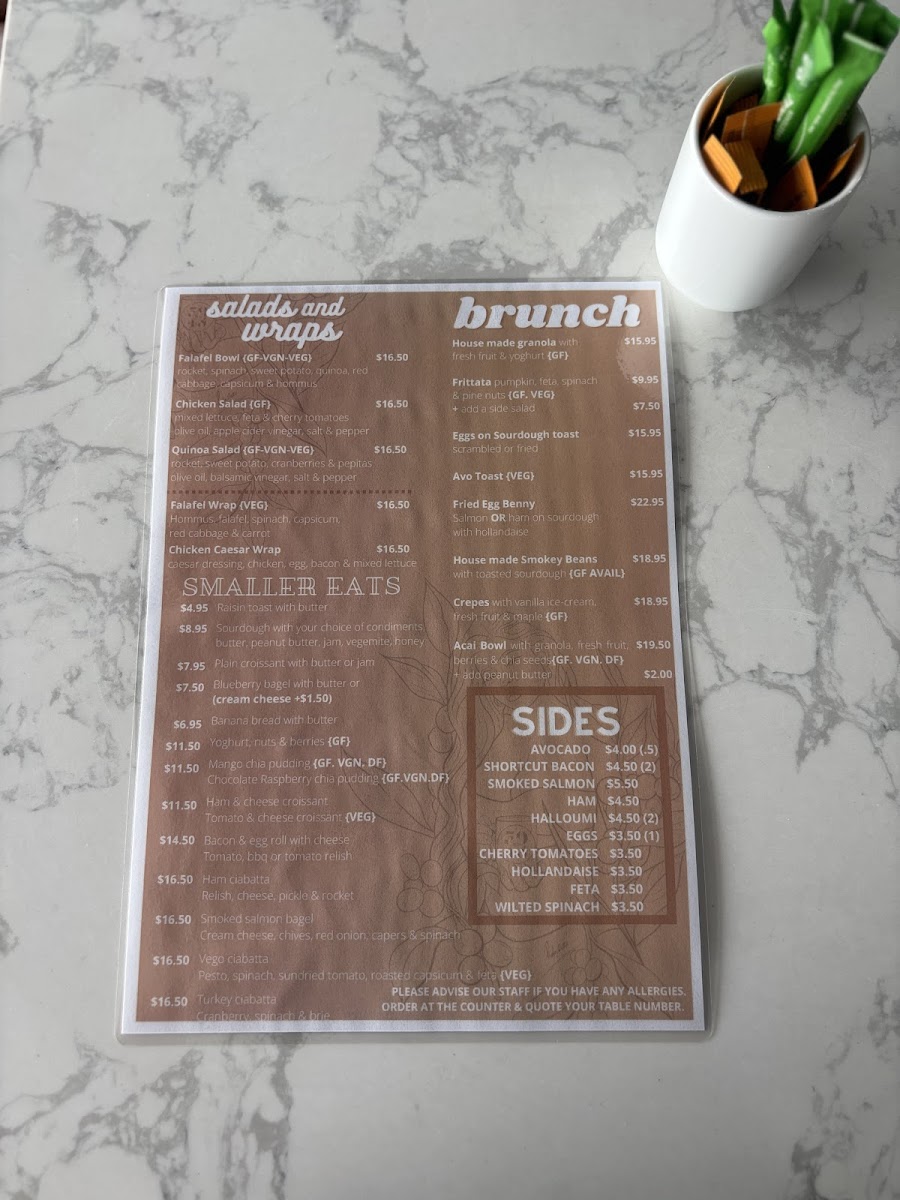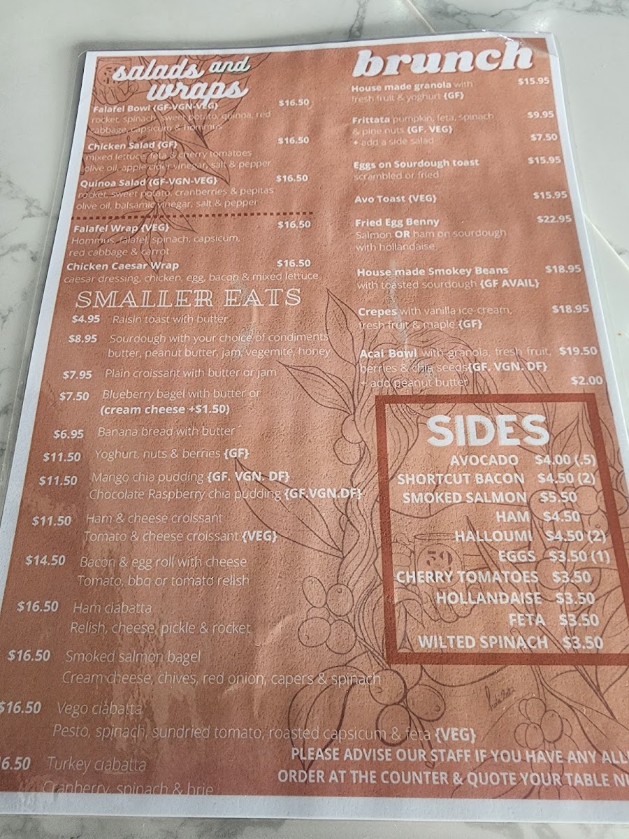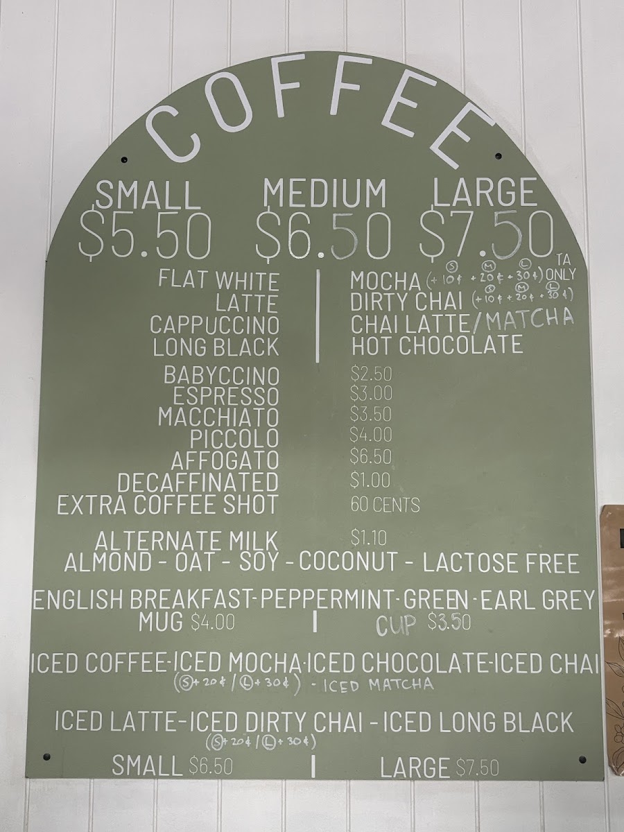 Dining at Miss 5048 Cafe offers a menu that strikes a balance between fresh, wholesome options and comforting brunch classics. The Salads and Wraps section features choices like Falafel Bowl, Chicken Salad, Quinoa Salad, as well as Falafel Wrap and Chicken Caesar Wrap, appealing to both vegetarians and meat lovers alike. Brunch favorites include House Made Granola, Frittata, Eggs On Sourdough Toast, Avo Toast, and the indulgent Fried Egg Benny, providing both light and hearty options. For smaller bites, the café serves Raisin Toast With Butter, Sourdough With Your Choice Of Condiments, Plain Croissant With Butter Or Jam, Blueberry Bagel With Butter, and Banana Bread With Butter, perfect for a quick snack or complement to a coffee. On the side, diners can enhance their meals with Avocado, Shortcut Bacon, Smoked Salmon, Ham, or Halloumi, allowing for customizable plates. The beverage menu is equally inviting, featuring coffee staples like Flat White, Cappuccino, Long Black, playful options like Babyccino and Dirty Chai, alongside Kids Smoothies in Banana or Mango and refreshing Iced Coffee and Iced Latte. Overall, the menu at Miss 5048 Cafe presents a thoughtful mix of fresh, flavorful dishes, flexible portions, and an approachable price range, making it a reliable spot for casual brunches, light lunches, or a relaxed coffee break.